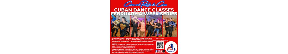 Tuesdays, 7:15-8:00 pm (beginner) and 8:15-9:00 pm (intermediate*), mini social (open dancing) between classes St. Barnabas Church, 262 Main St, Norwich, VT (rear parish hall) Cost (monthly progressive* classes): 4 weeks ($25) or $10/class (beginner class free for intermediate students) Pre-register online at uvcasineros.square.site or pay with cash, Venmo, card, or check in class (please arrive 5 min early)