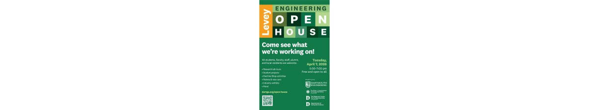 Tuesday, April 7, 2026 Open House will be held inside Dartmouth's Thayer School of Engineering and Arthur L. Irving Institute for Energy and Society's labs, project spaces, and atriums. (Google Map | Campus Map) Free and Open to All